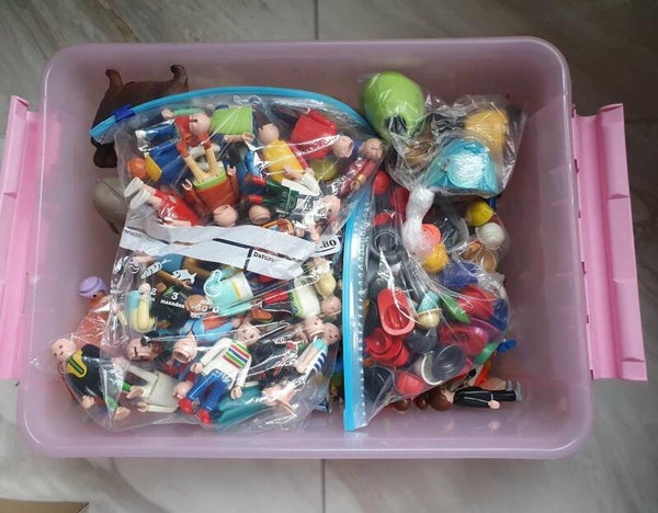 Een A4 bak vol met verschillende playmobilpoppen, plastic dierfiguren en houten blokjes voor het gebruik tijdens vrij spel of familieopstellingen.