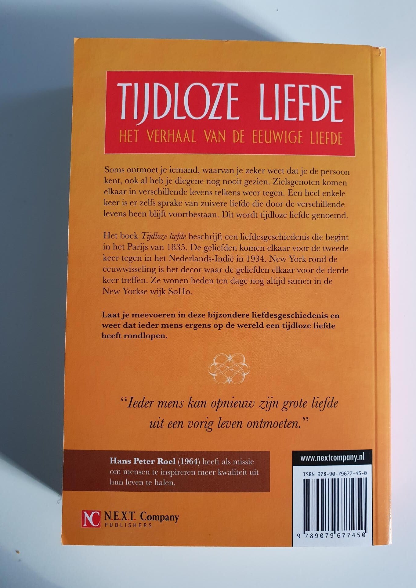 Tijdloze liefde; Het verhaal van de eeuwige liefde "Ieder mens kan opnieuw zijn grote liefde uit een vorig leven ontmoeten." Soms ontmoet je iemand, waarvan je zeker weet dat je de persoon al kent, ook al heb je diegene nog nooit gezien. Zielsgenoten komen elkaar in verschillende levens telkens weer tegen. Een heel enkele keer is er zelfs sprake van zuivere liefde die door de verschillende levens heen blijft voortbestaan. Dit wordt tijdloze liefde genoemd. Het boek "Tijdloze liefde" beschrijft een liefdesgeschiedenis die begint in het Parijs van 1835. De geliefden komen elkaar voor de tweede keer tegen in het Nederlands-Indië in 1934. New York rond de eeuwwisseling is het decor waar de geliefden elkaar voor de derde keer treffen. Ze wonen heden ten dage nog altijd samen in de wijk New Yorkse wijk SoHo. Laat je meevoeren in deze bijzondere liefdesgeschiedenis en weet dat ieder mens ergens op de wereld een tijdloze liefde heeft rondlopen. Hans Peter Roel (1964) heeft als missie om mensen te inspireren meer kwaliteit uit hun leven te halen.