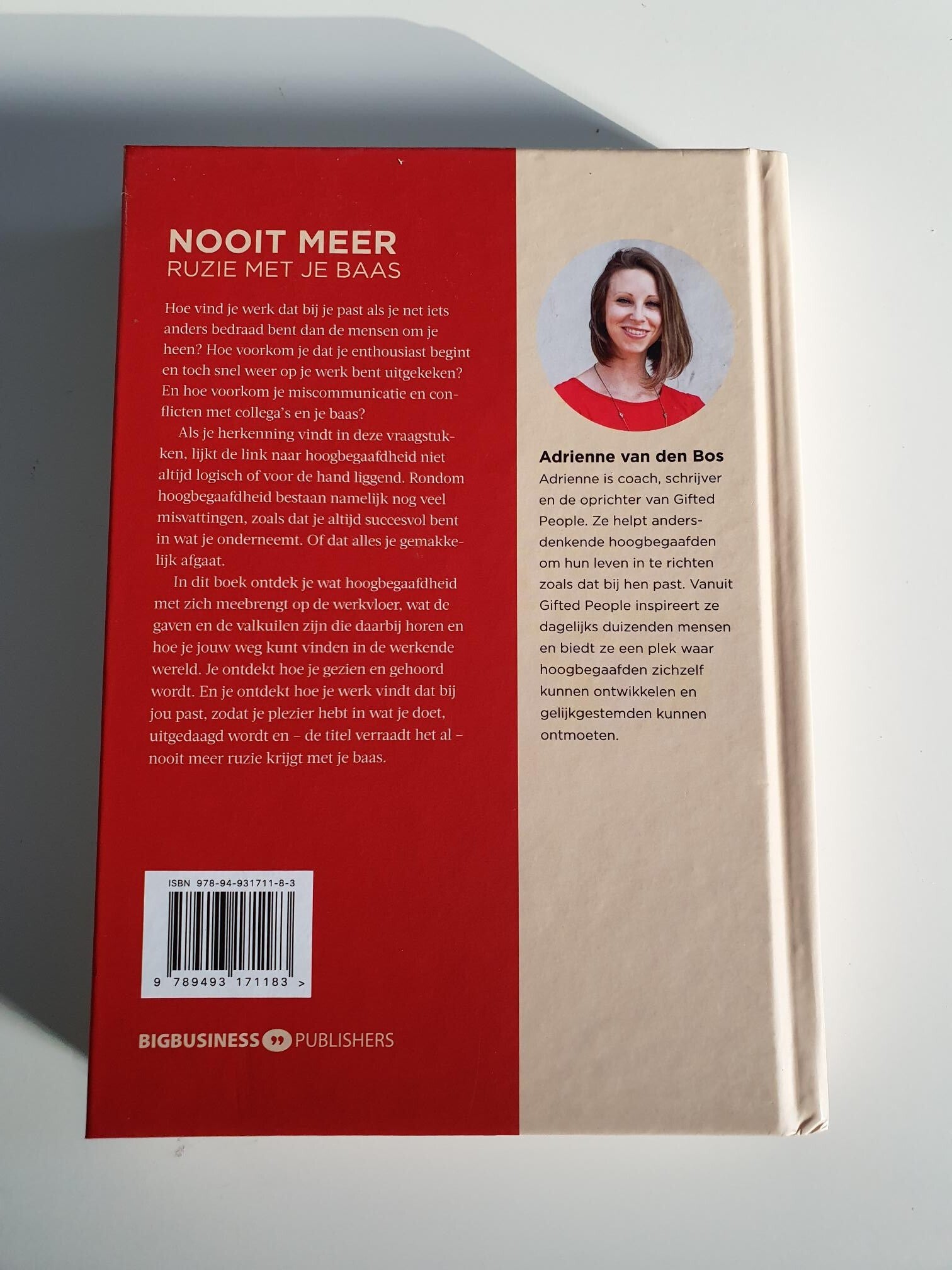 Hoe vind je werk dat bij je past als je net iets anders bedraad bent dan de mensen om je heen? Hoe voorkom je dat je enthousiast begint en toch snel weer op je werk bent uitgekeken? En hoe voorkom je miscommunicatie en conflicten met collega’s en je baas? Als je herkenning vindt in deze vragen, lijkt de link naar hoogbegaafdheid niet altijd logisch of voor de hand liggend. Rondom hoogbegaafdheid bestaan namelijk nog veel misvattingen, zoals dat je altijd succesvol bent in wat je onderneemt. Of dat alles je gemakkelijk afgaat. In dit boek ontdek je wat hoogbegaafdheid met zich meebrengt op de werkvloer, wat de gaven en de valkuilen zijn die daarbij horen en hoe je je weg kunt vinden in de werkende wereld. Je ontdekt hoe je gezien en gehoord wordt. En je ontdekt hoe je werk vindt dat bij je past, zodat je plezier hebt in wat je doet, uitgedaagd wordt en – de titel verraadt het al – nooit meer ruzie krijgt met je baas. Adrienne van den Bos is coach, auteur en de oprichter van Gifted People. Ze helpt andersdenkende hoogbegaafden om hun leven in te richten zoals dat bij hen past. Vanuit Gifted People inspireert ze dagelijks duizenden mensen en biedt ze een plek waar hoogbegaafden zichzelf kunnen ontwikkelen en gelijkgestemden kunnen ontmoeten.